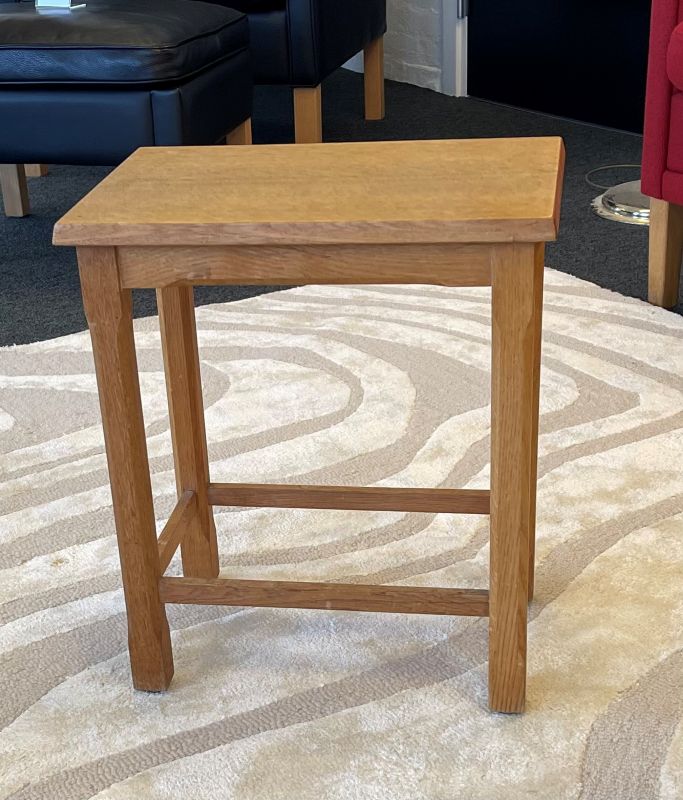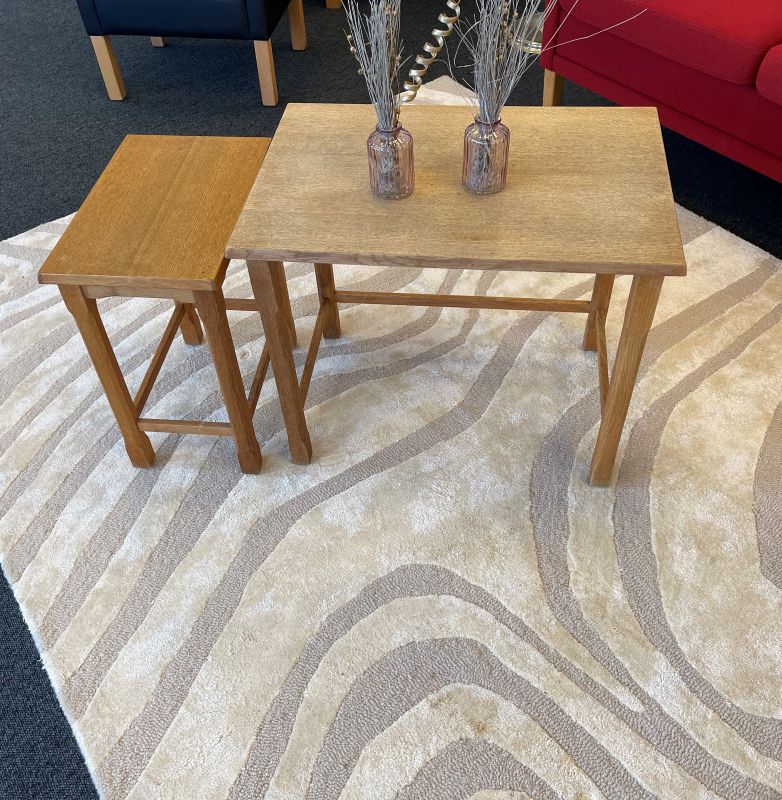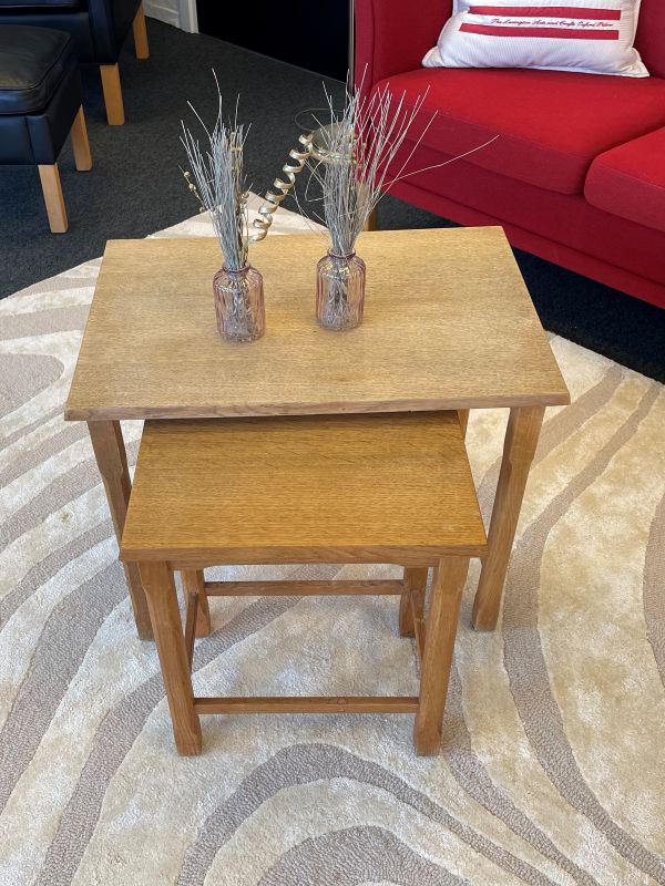 Pris kr. 600 pr. stk. Euro 83, pr. stk. 2 stk. indskudsborde i egetræ sæbebehandlet. Mål: store Længde 60 cm, højde 50 cm, bredde 40 cm. Lille længde 38 cm, højde 46 cm, bredde 25 cm.