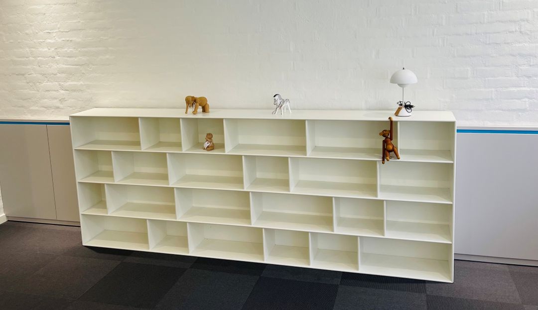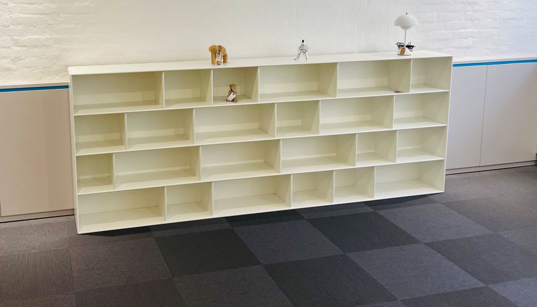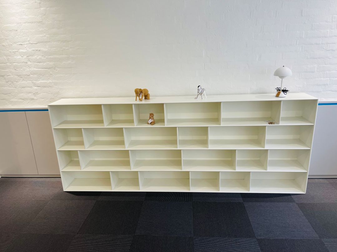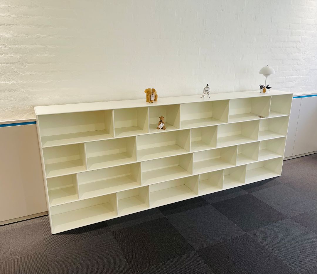Special lavet model. Pris kr. 11.000,- Euro 1.470,- Hvid Montana reol med mange hylder i forskellige størrelser. Mål: Længde 260 cm, højde 100 cm. Dybde 30 cm. Ophæng medfølger.